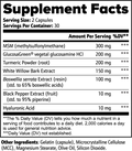 Ingredients: MSM (methylsulfonylmethane), GlucosaGreen® vegetal glucosamine HCl, Turmeric Powder (root), White Willow Bark Extract, Boswellia serrata Extract (resin)(std. to 65% boswellic acids), Black Pepper Extract (fruit) (std. to 95% piperine), Hyaluronic Acid, Gelatin (capsule), Microcrystalline Cellulose (MCC), Magnesium Stearate, Olive Oil, Silicon Dioxide.