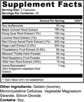 Ingredients: Soy Isoflavones (30 mg), Black Cohosh Root Extract (160 mg), Dong Quai Root Extract (1%) (150 mg), Licorice Root Extract (1%) (150 mg), Red Clover Aerial Parts Extract (1%) (400 mg), Sage Leaf Extract (2.5%) (200 mg), Chasteberry Fruit Extract (0.5%) (50 mg), Blessed Thistle Herb Powder (50 mg), Red Raspberry Fruit Powder (50 mg), Wild Yam Root Extract (16%) (15 mg), trans-Resveratrol (from Polygonum cuspidatum Root Extract) (1 mg), Gelatin (bovine), Microcrystalline Cellulose, Vegetable Magnesium Stearate, Silicon Dioxide.